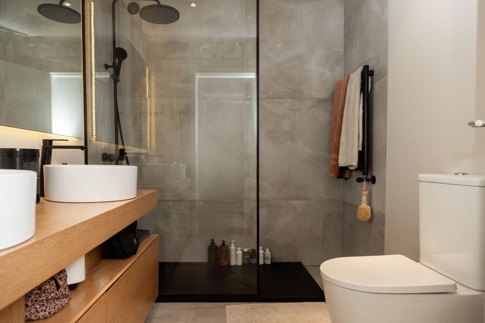 The property is organized across two levels, with the main living areas located on the ground floor. Here, the open-plan kitchen, dining, and living room connect directly to a south-facing private garden of 67 m², creating a natural extension of the interior space and allowing for outdoor dining, relaxation, or family use.
