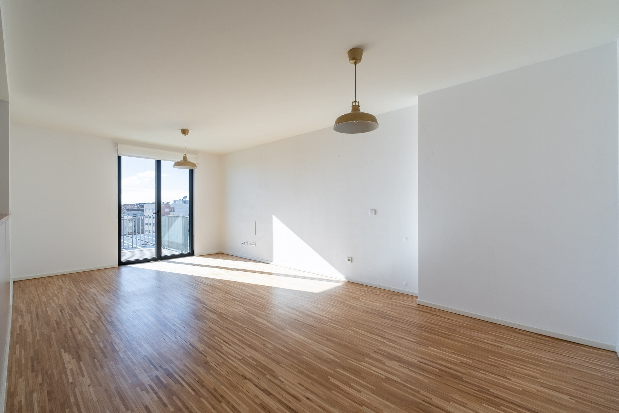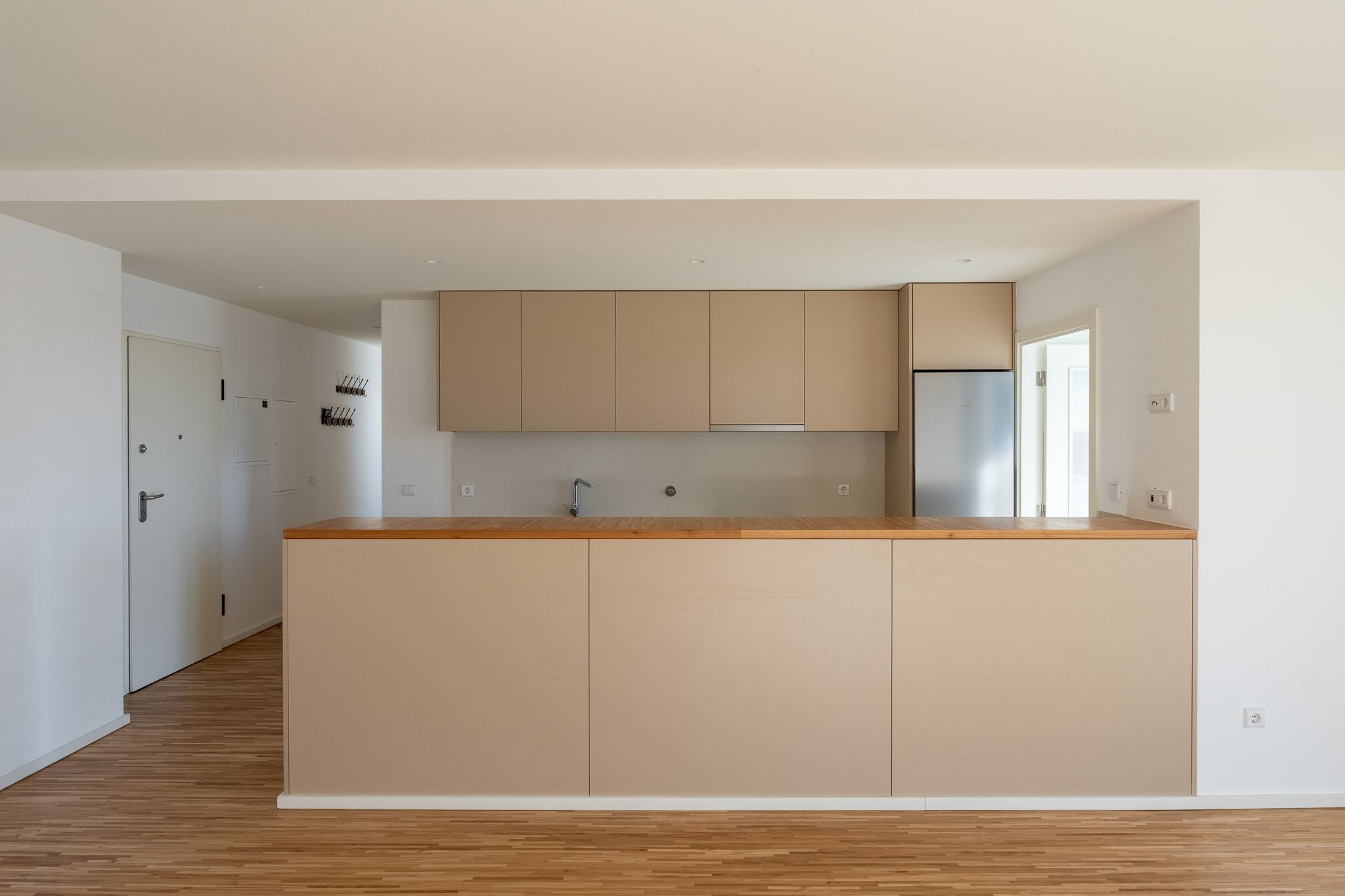 The living area is generously proportioned, with approximately 25 m², seamlessly connecting to the kitchen and extending toward the outdoor balcony. The kitchen features clean, modern cabinetry and durable countertops, designed for both everyday use and entertaining.